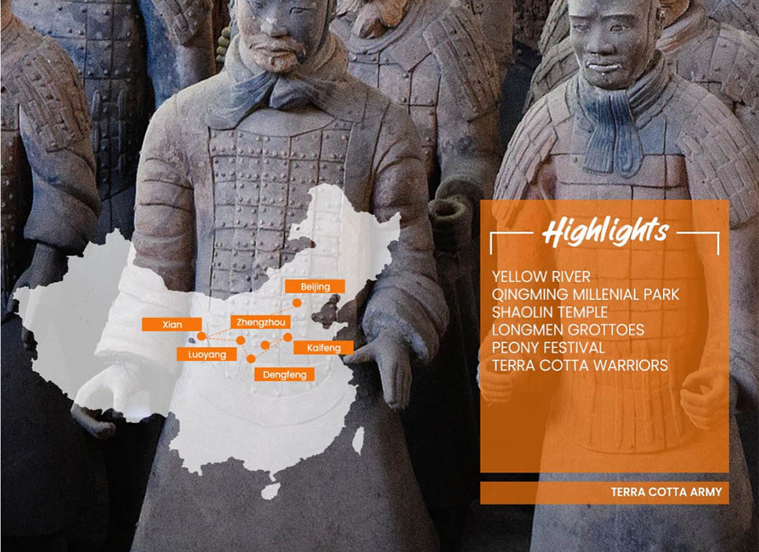 Pagi ini anda akan mengunjungi salah satu situs warisan dunia, Terra Cotta Warriors and Horses Museum (兵马俑). Kemudian mengunjungi Huaqing Pool(華清池) yang terkenal akan cerita Kaisar Xuanzong dan selir Yang Yu Huan. Sorenya mengunjungi Big Wild Goose Pagoda (大雁塔). ( Santap pagi siang dan malam ).