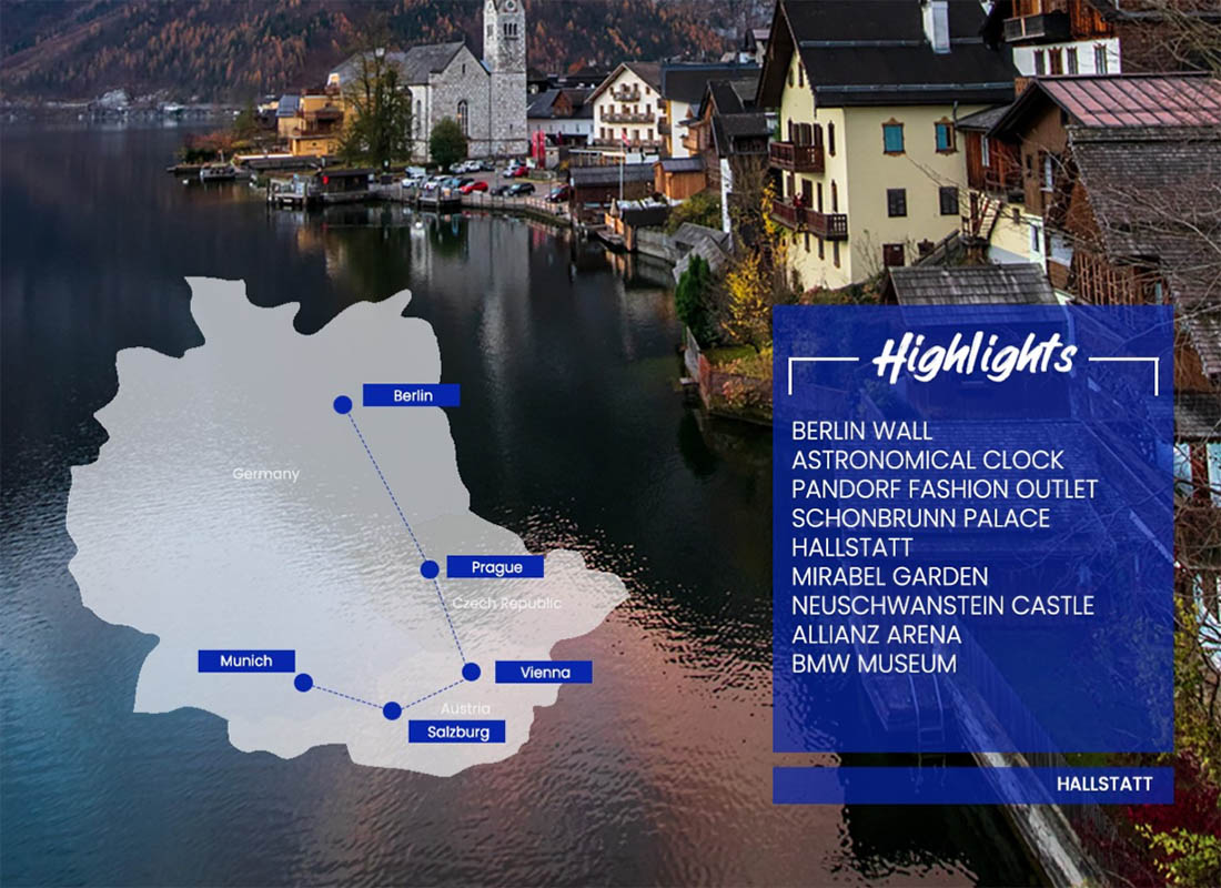 Hari ini anda akan mengunjungi Hallstatt, salah satu desa indah mirip dengan negeri dongeng yang terletak di sekitaran danau Hallstatter. Setelah makan siang melanjutkan perjalanan hingga ke Salzburg. Setibanya di Salzburg, anda akan di ajak untuk photo stop di Mirabel Garden yang menjadi backdrop shooting film Sounds of Music. Kemudian photo stop di depan House of Mozart dan shopping di Getreidegasse. (Santap pagi, siang dan malam).