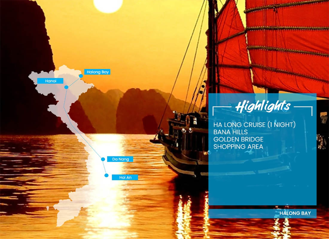 Berkumpul di bandara internasional Kuala Namu untuk persiapan keberangkatan ke Danang dengan transit di Singapore. Setibanya di Danang, city tour mengunjungi Ancient Town Center yang mencakup Japanese Bridge yang telah berusia 400 tahun, Chinese Communal Hall. Sorenya acara shopping di Hoi An Market. ( Santap malam ).