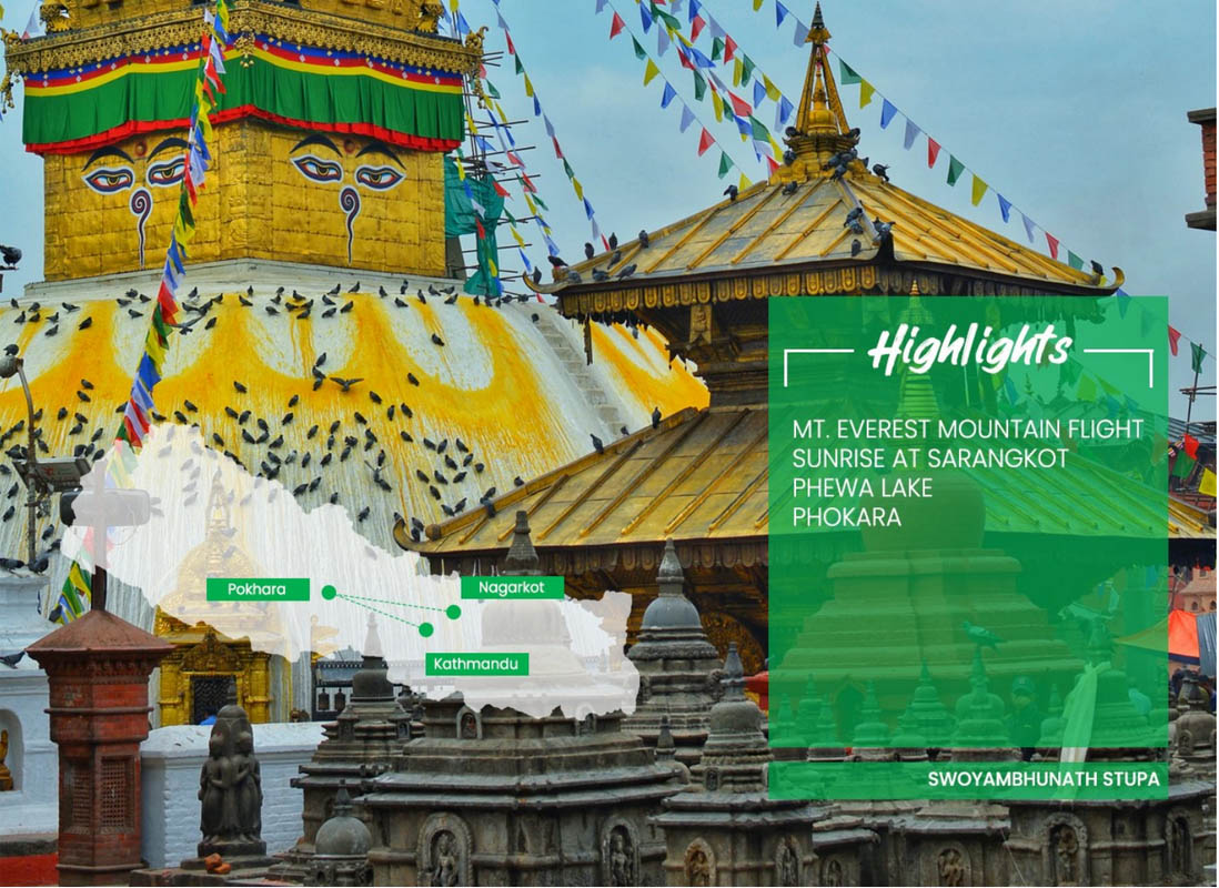 Setelah sarapan pagi, anda akan city tour mengunjungi Durbar Square, sebuah halaman yang di bangun antara abad 12 – 18 dan pernah menjadi pusat pemerintanhan raja-raja Malla kuno di Kathmandu, di mana anda dapat melihat sebuah prasasti yang ditulis dalam 15 bahasa. Alun – alun ini dilindungi oleh Unesco sebagai situs warisan dunia. Kemudian mengunjungi Pashupatinath Temple , salah satu kuil Hindu paling suci di dunia. Kuil ini terletak 5 km di sebelah timur pusat kota. Kemudian mengunjungi Stupa Boudhanath, merupakan stupa terbesar yang ketinggiannya mencapai 36 meter. Kemudian menikmati pemandangan Mount Everest dari Mount Everest Mountain Flight selama 2 jam. ( Santap pagi, siang dan malam ).