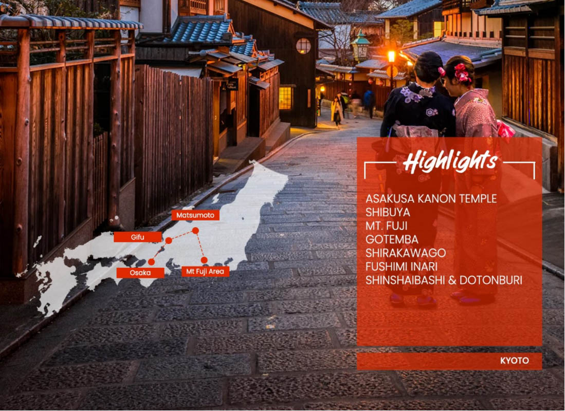 Pagi ini tiba di Tokyo. City tour di Tokyo akan dimulai dengan mengunjungi Asakusa Kanon Temple dan kulineran di Nakamise Shopping Street. Photo stop di Tokyo Sky Tree dan Shibuya Area. Tidak lupa mengunjungi Hachiko Statue. Sorenya acara shopping di Ginza Street. Kemudian melanjutkan perjalanan ke Fuji Area untuk menginap. ( No Meals ).